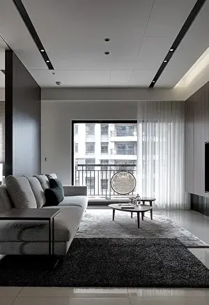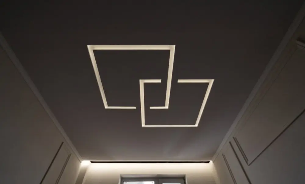 Șine LED moderne încorporate, care creează modele geometrice clare și o iluminare uniformă și delicată, fără surse de lumină vizibile.