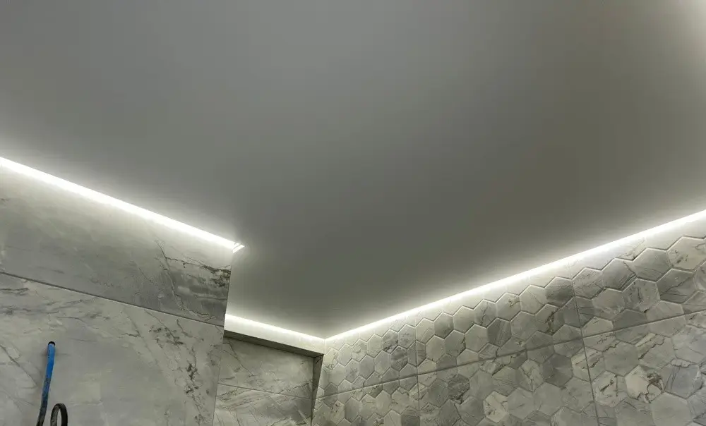 Iluminare ascunsă pe perimetru, care creează efectul de tavan plutitor. Separă vizual pânza de pereți, adăugând interiorului finețe și un aer futurist.